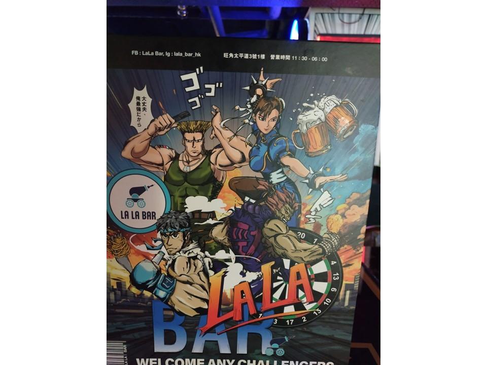 案内されたのは「La La Bar」というカラオケのできるダーツバーでした。何故か店の外で鳴り響いていたのは久保田利伸の「LA・LA・LA LOVE SONG」。また、店内のメニューには無断使用と思しきストリートファイターのキャラクターがふんだんに使われており、絶対言わなさそうなセリフを言っているガイル、背中の文字が「天」ではなく「勁」になっている豪鬼、全く姿のみえないフェイロンなど突っ込みどころが盛沢山でした。