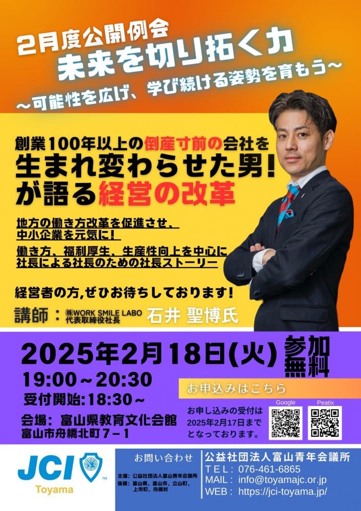 第1回目となる今回の公開例会では、株式会社WORK SMILE LABOの石井聖博氏をお迎えし、「未来を切り拓く力」をテーマに講演を行います。