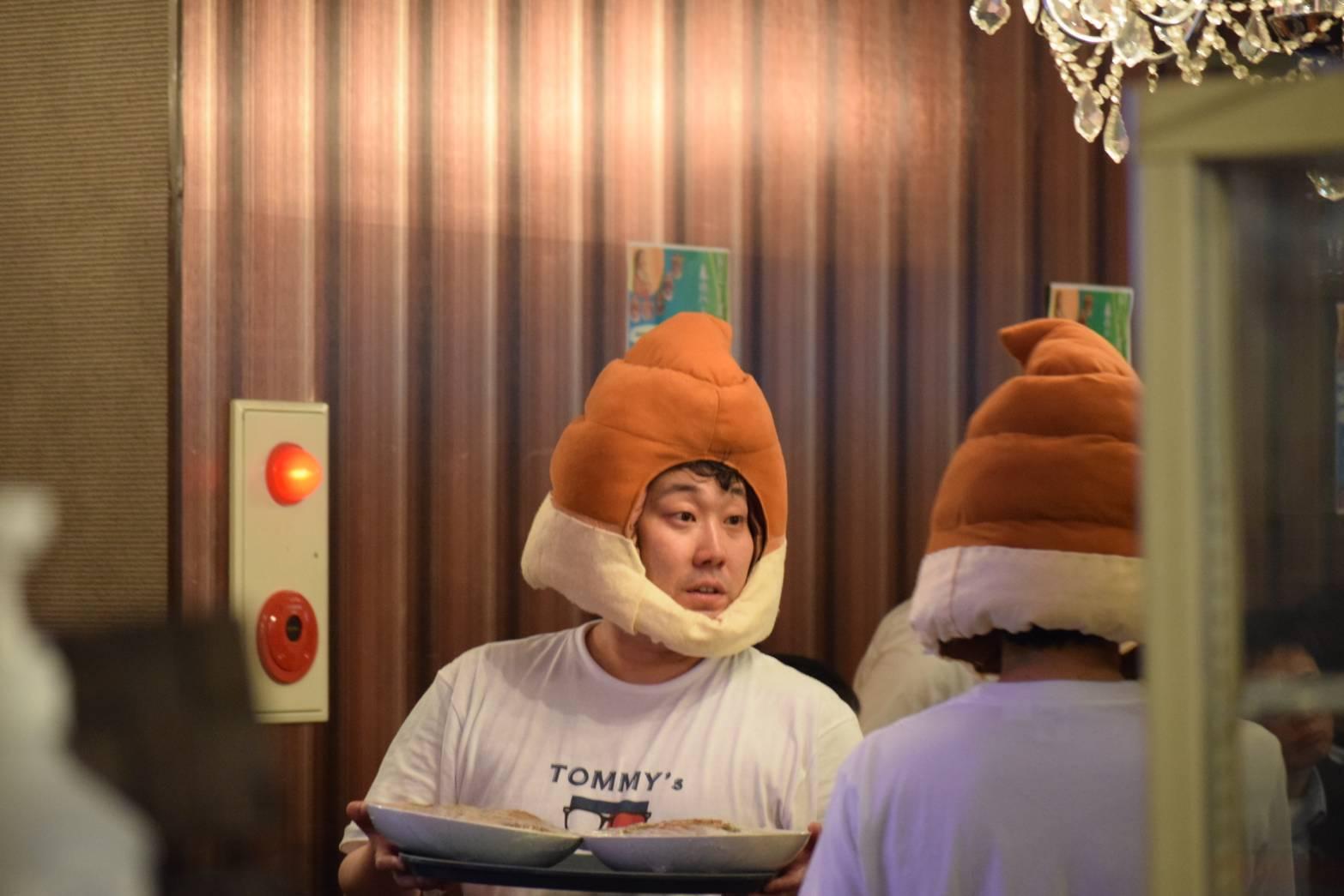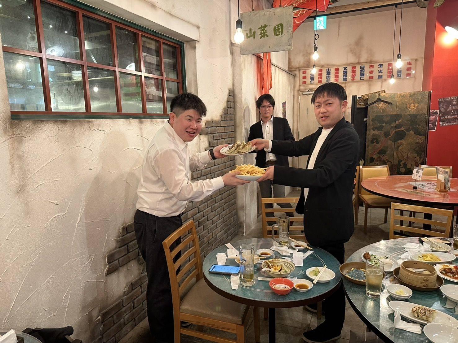 懇親会はCIC1階の【小吃】で行われており、私は途中からの参加でしたが、到着するとデカ盛り餃子とデカ盛りポテトフライを注文していただき、「一人で食べてもいいよ」とのお達しが。早速がっつき、その後も皆さんが注文した料理を遠慮なくガンガンいただいていると、ふと怪しげな紙袋が準備されているのに気づきました。