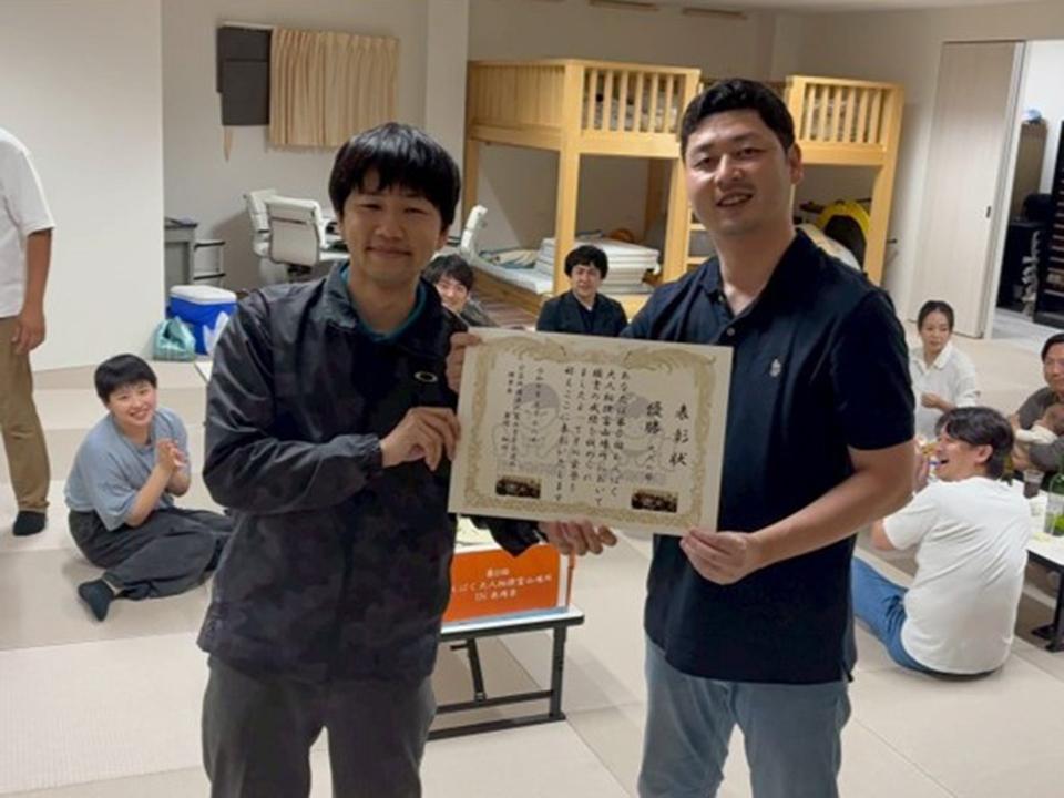 和やかな雰囲気の中、突如始まった余興「第0回わんぱく大人相撲富山場所」ではトントン相撲による全員参加・情け無用の取組が行われ大変盛り上がりました。そして、なんやかんやで「勇気・礼節・感謝」のパラメータが低そうな私が何故か優勝しました。