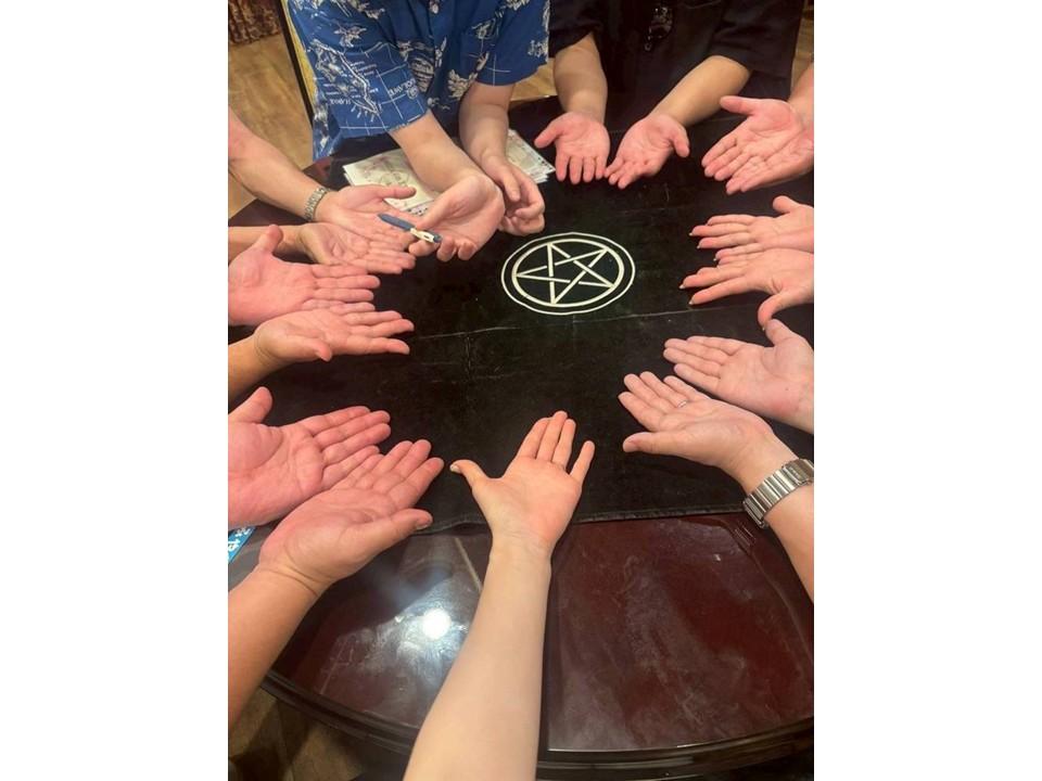 アカデミー委員のみんなで1つの円卓を囲み、両手を出して手相占いをしてもらいました。