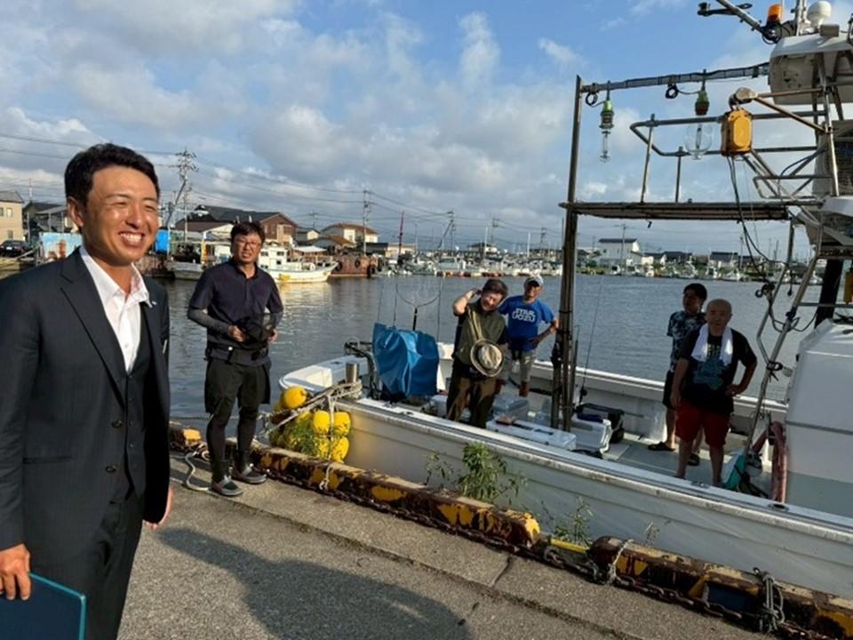まず出航前に財務・規則・渉外委員会の喜多埜委員長が8月度公開例会の案内に来てくれました。漁港にスーツ姿でこのためだけに金沢まで来たことを考えると驚きです。熱意はシニア会員の方々にもしっかり伝わっていたと感じました。お疲れ様です。