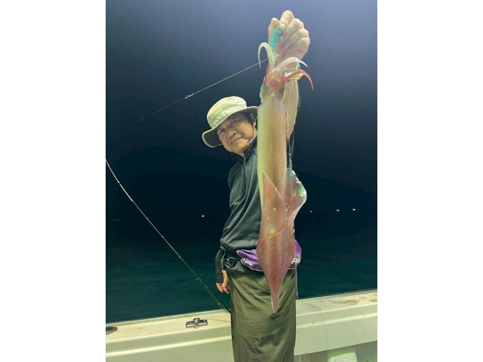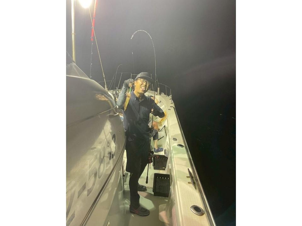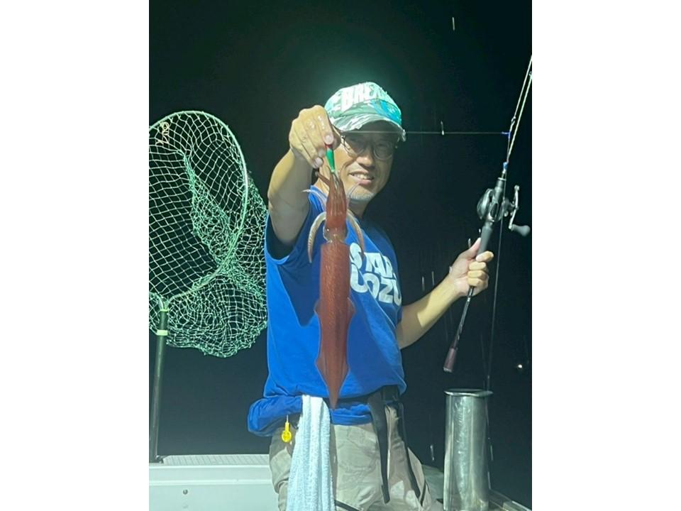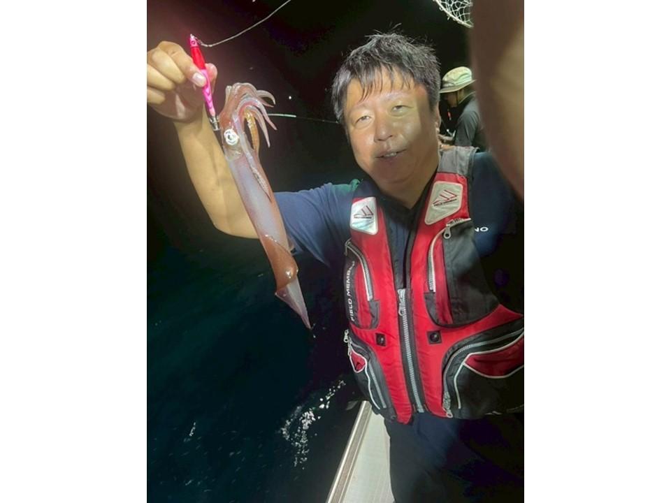 そこで、ポイントを移動。反応がまたしてもなく、船の電灯が点いた頃でしょうか?石橋先輩が最初のヒット!それを合図に船中の皆さまに続けてヒット!先ほどまでの渋い状況とは異なり、釣りあげたイカを見てホッとしました。隣の大久保君は、アカイカ釣り(イカメタル)は初めてだったようで、船長のレクチャーを受けながら待望の一匹を釣り上げ最高の笑顔を見せてくれました。その後も続々と大物交じりでイカが上がりました。長谷川先輩の釣った剣のような大イカに船中大盛り上がりでした。皆さま楽しんでいただけて何よりです!