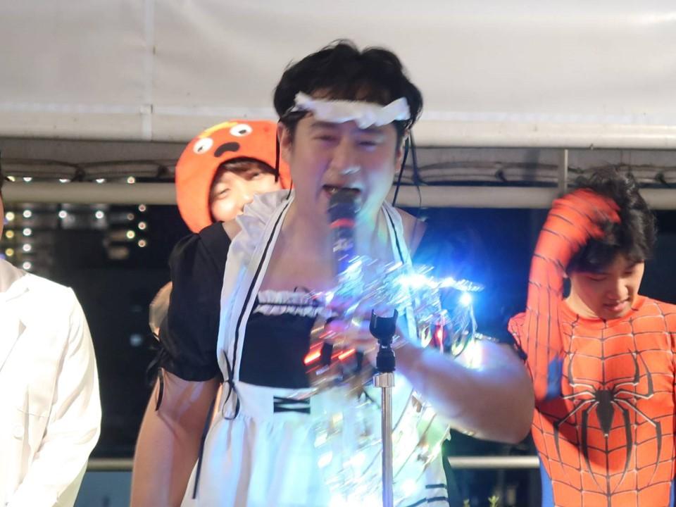 緊張の中、同期入会のコブ・ヒデキ・ハーモニーを見て「自分はまだまだ甘い」と感じるほど衝撃的な衣装でした。大変失礼しました。