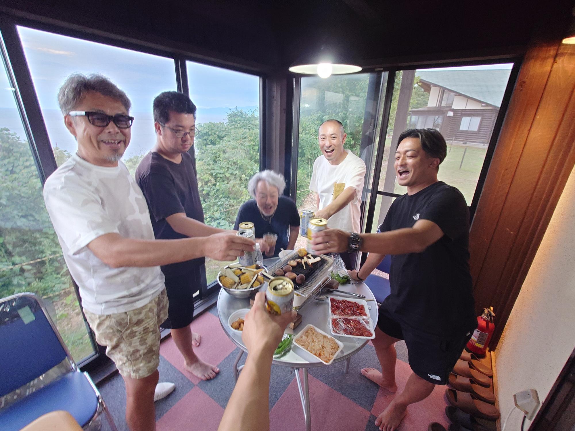今回の旅の合言葉は、やはり「着・即・呑」(ちゃくそくどん)。到着するやいなや乾杯し、昼から完全にお祭りモード。コテージ一棟を丸ごと借り、天候に左右されない屋内バーベキュー場で肉と酒が飛び交う。昼からお風呂を楽しむセクシー森口先輩、白ホルモンにかぶりついてご満悦の奥野先輩、キャンプ場を勘違いして志賀町まで行ってしまった竹原くん(完璧な三段オチw)