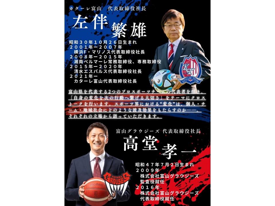 富山を代表するプロスポーツクラブのトップお二人をお招きし、クロストーク形式で熱い想いを語っていただきます!