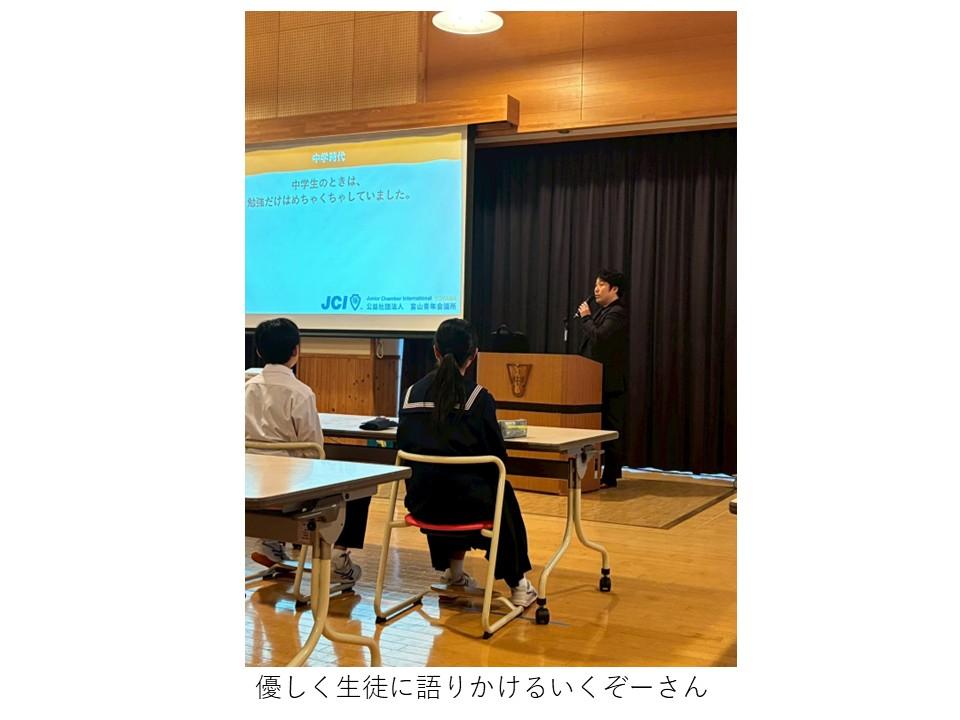 一緒に講師として訪問した義永さんが一人目の講師を務め、生徒の皆さんは両手を膝に置き、背筋を伸ばして真剣に話を聞いていました。