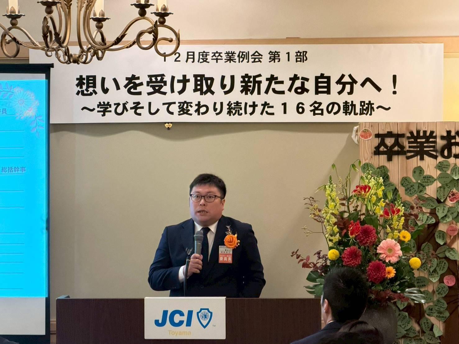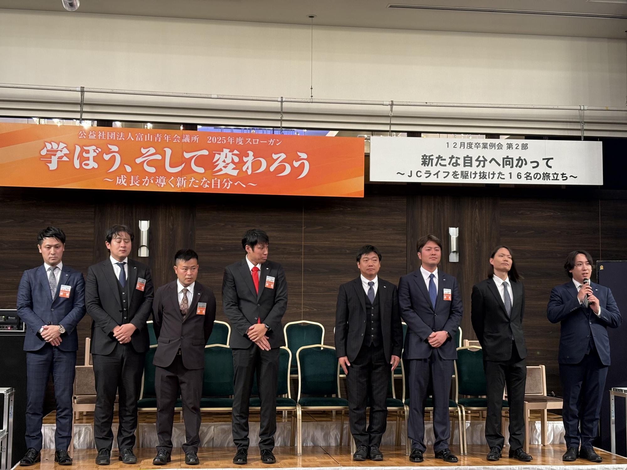 まず、16名の卒業生の皆さま。この度はおめでとうございます。これまで富山青年会議所を支え、導いてくださり、心より感謝申し上げます。また、例会委員会の皆さま。連日深夜まで続く準備や、当日の進行等ありがとうございました。